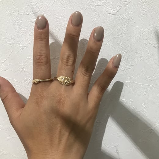 アンティーク感のある目玉リング。他のリングと一緒に着けても馴染んでくれるよう、平面を意識して作りました。ちょっと手にユーモアを出したい、そんな日におすすめです。